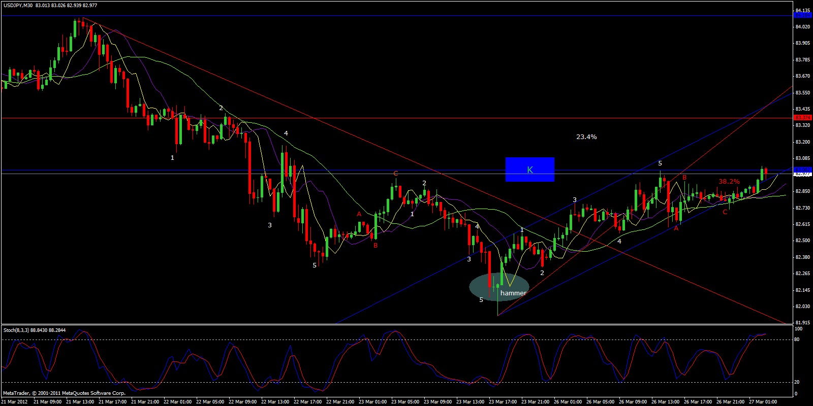 As you see by the 30min chart I'm waiting for a mild retreat to get long again. The pair stopped just before the 38.2% trend line and touched the confluence (K)