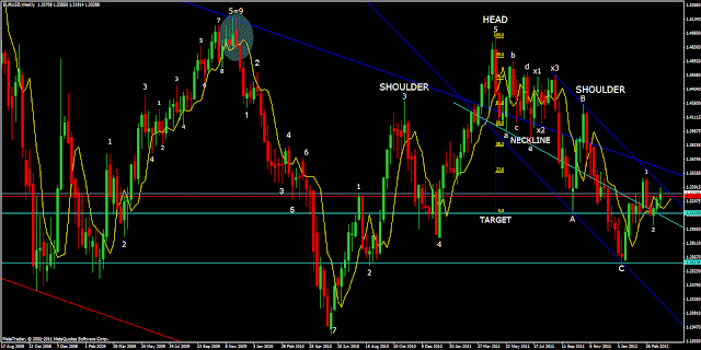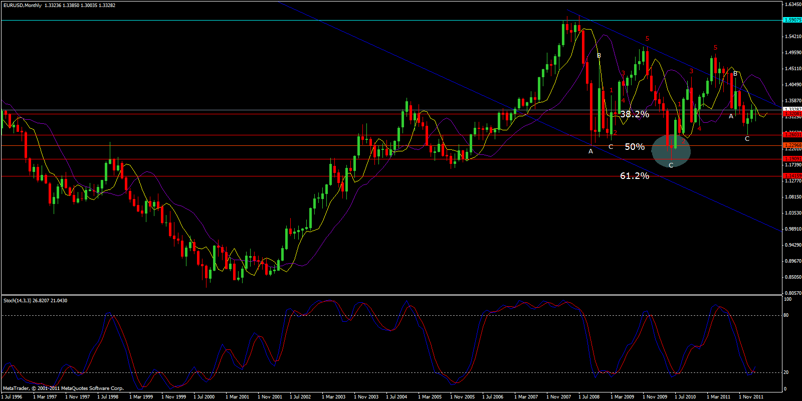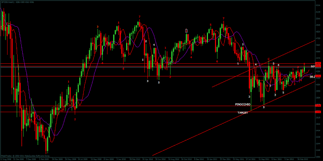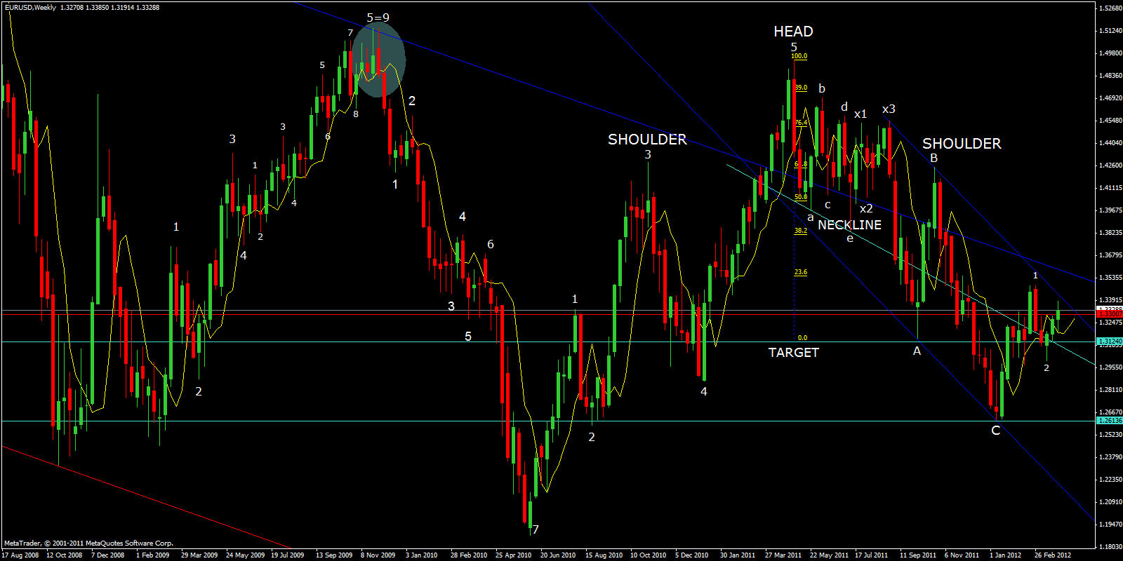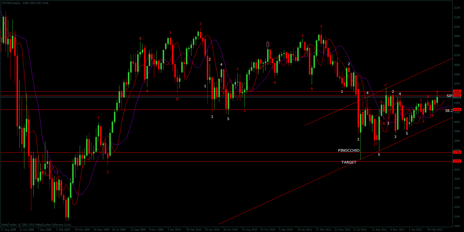 In the WEEKLY CHART below I use a count of 7 waves - in red - which is equivalent to a 3 wave retracement pattern. Instead a count of 9 is equivalent to a 5 wave pattern - in white.