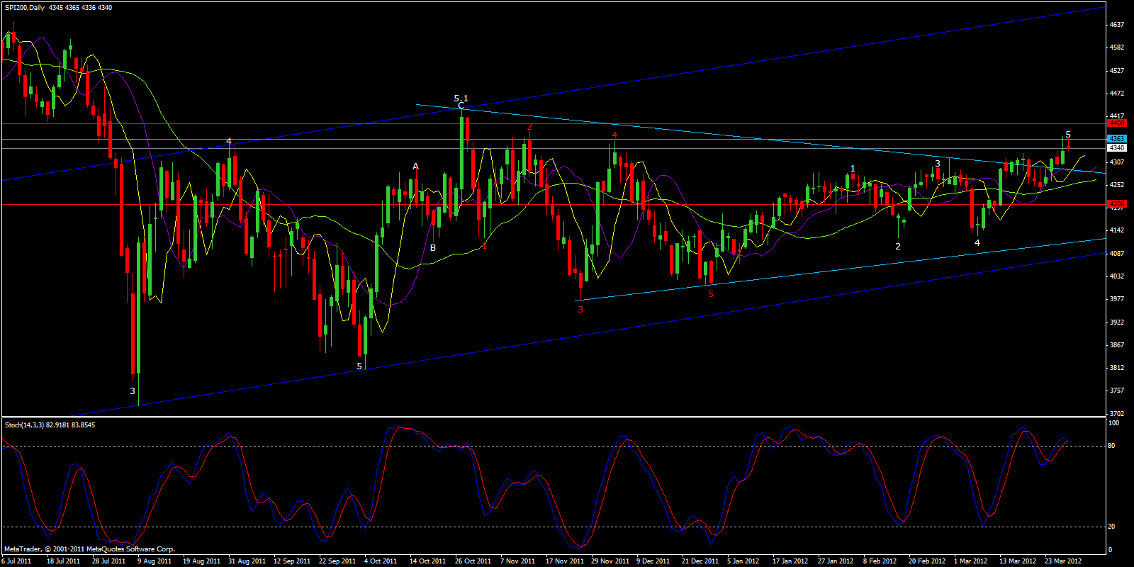 Starting from the MONTHLY CHART below, it's preatty clear that the SPI200 failed to reach level 4,400 and it actually stopped right on level 50% (4,363). If an A-B-C-D-E unfolds the target could be 3,700.