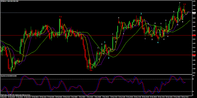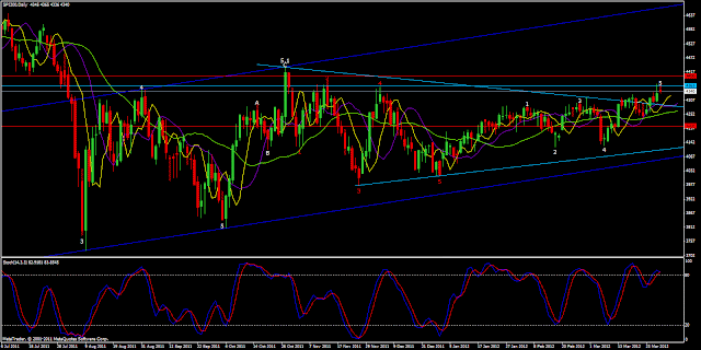 The daily chart below confirms 5 waves up - in white. Short tem target a 4,200 (the red line). Note the channel in blue: the chart touched the boundaries 4 times. Consequently, it's expected to breakout soon. The last wave up (wave 5) is considered a "through over", an indication of impending reversal according to Gann.