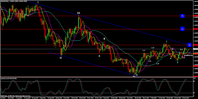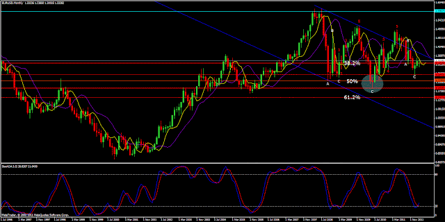 The EURUSD started the new uptrend almost 8 weeks ago as for the monthly chart below. After completing wave 1 and 2 is now heading for wave 3. But watch out: if the uptrend stops at the upper boundary of the blue channel - 1.3440-1.3480 - we would have to re-think the whole wave count.