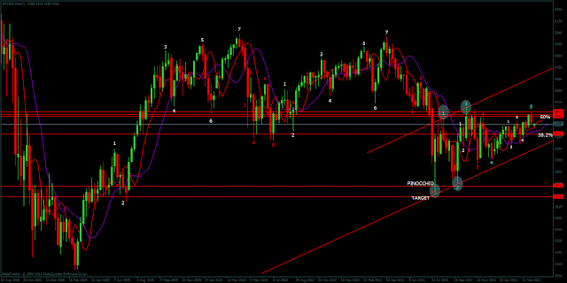 Note the yellow arrows: next June will mark 11 years since the major low in June 2001. Do we have to wait till June 2013 to complete 144 month and see a turning point? (Gann-Fibonacci number).