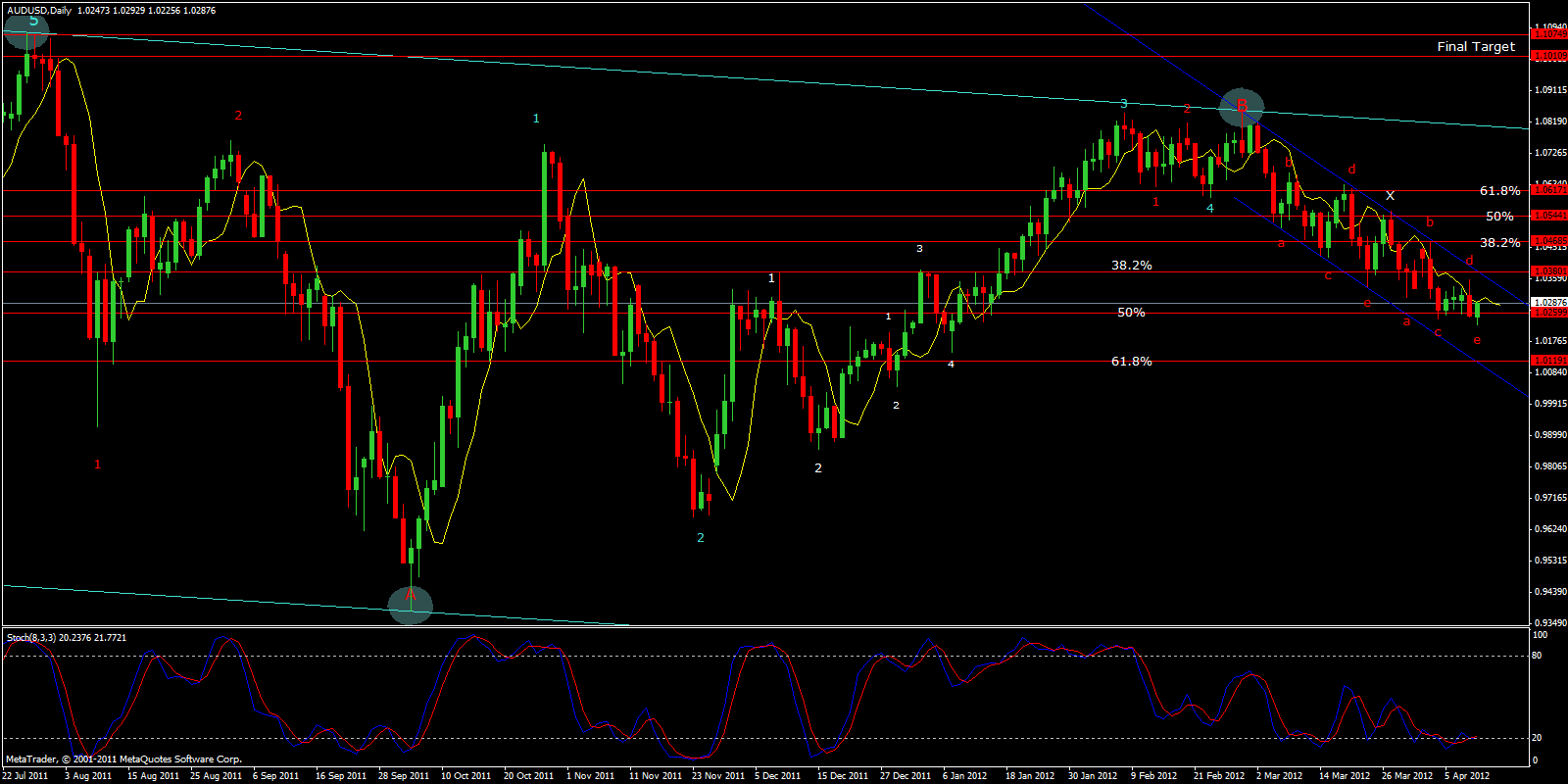 In the daily chart below the first leg of Wave C is structured in a common a-b-c-d-e-X-a-b-c-d-e, also known as the 5-3-5 retracement wave. If this wave is correct it will be followed by a rally to level 38.2% (1.04685) or higher.