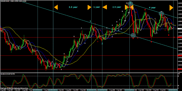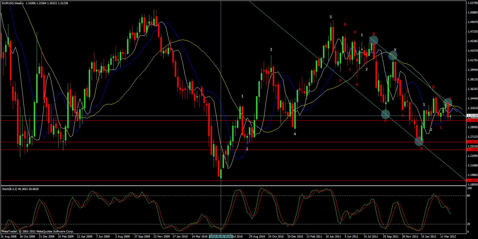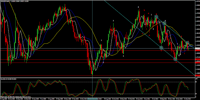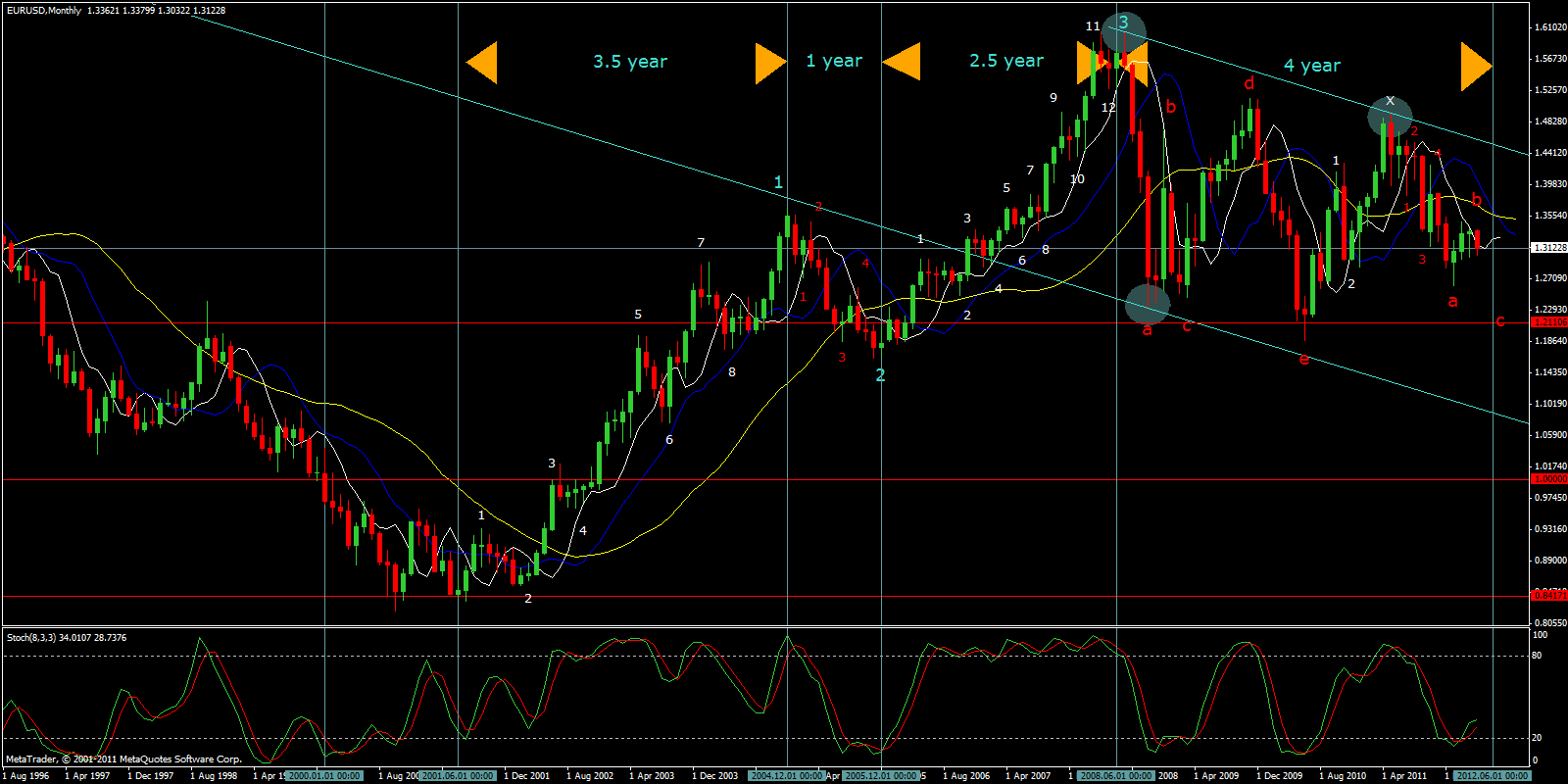 Euro monhly chart below started wave C down to 1.260-1.245. Theoretically this should be a 5 waves down. Stochastic on the way down again.