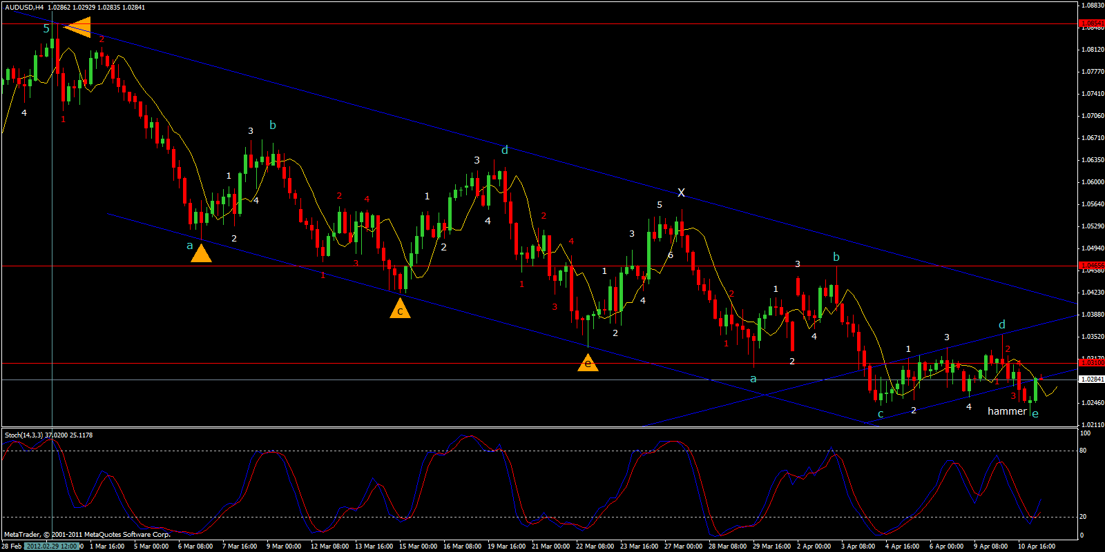 See the "hammer" in the 4hour chart below as it often occurs at the end of "wave e". It's a reversal pattern up and it shows the beginning of a temporary pullback.