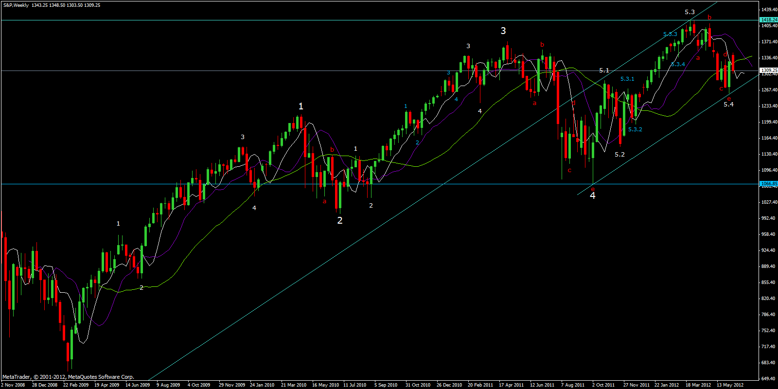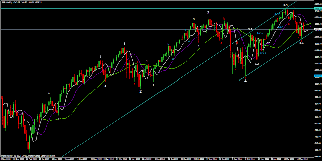 See the weekly chart of the S&P500 below where this index is set to complete the (very last) 5th wave up within the 5th wave of major grade.