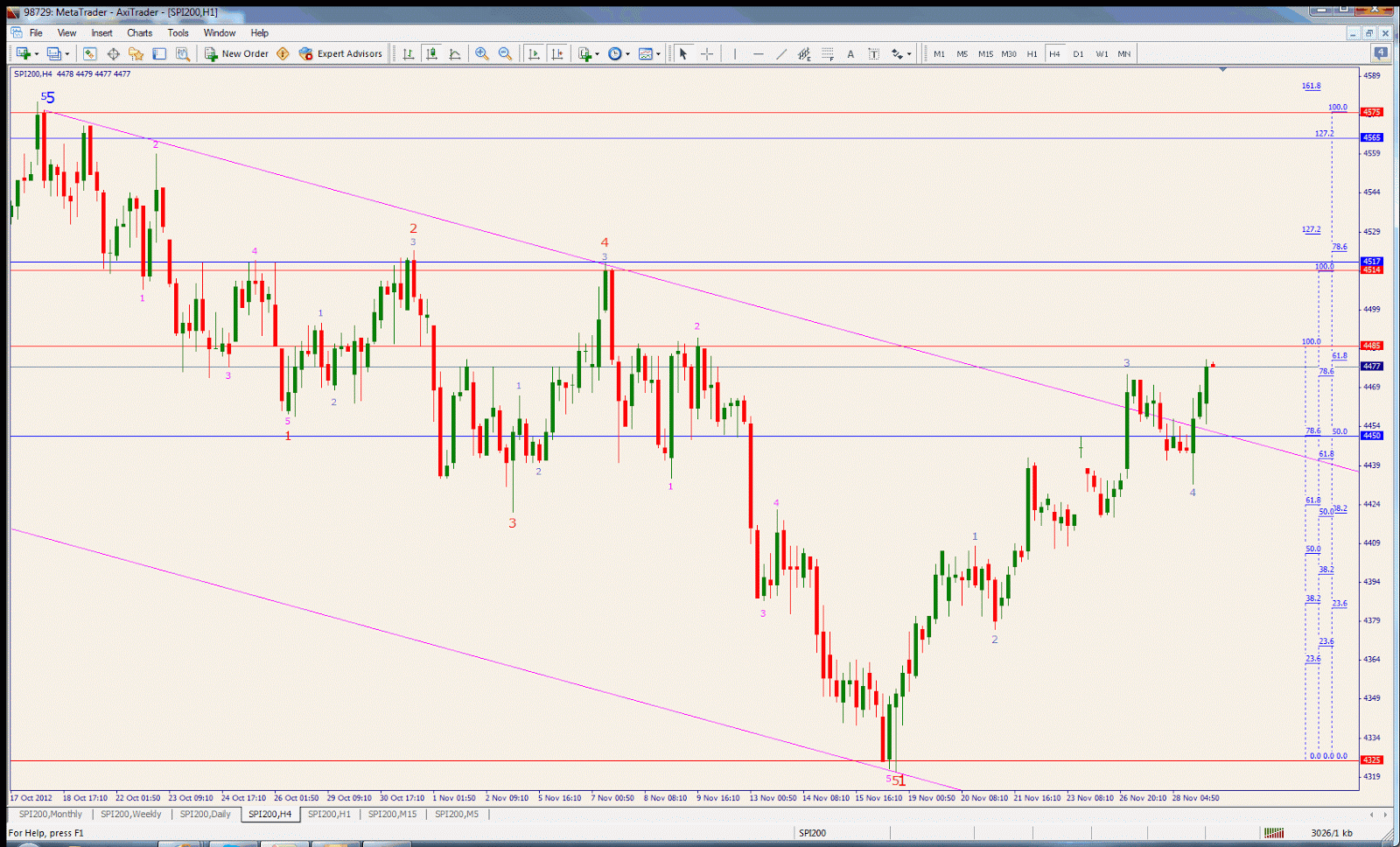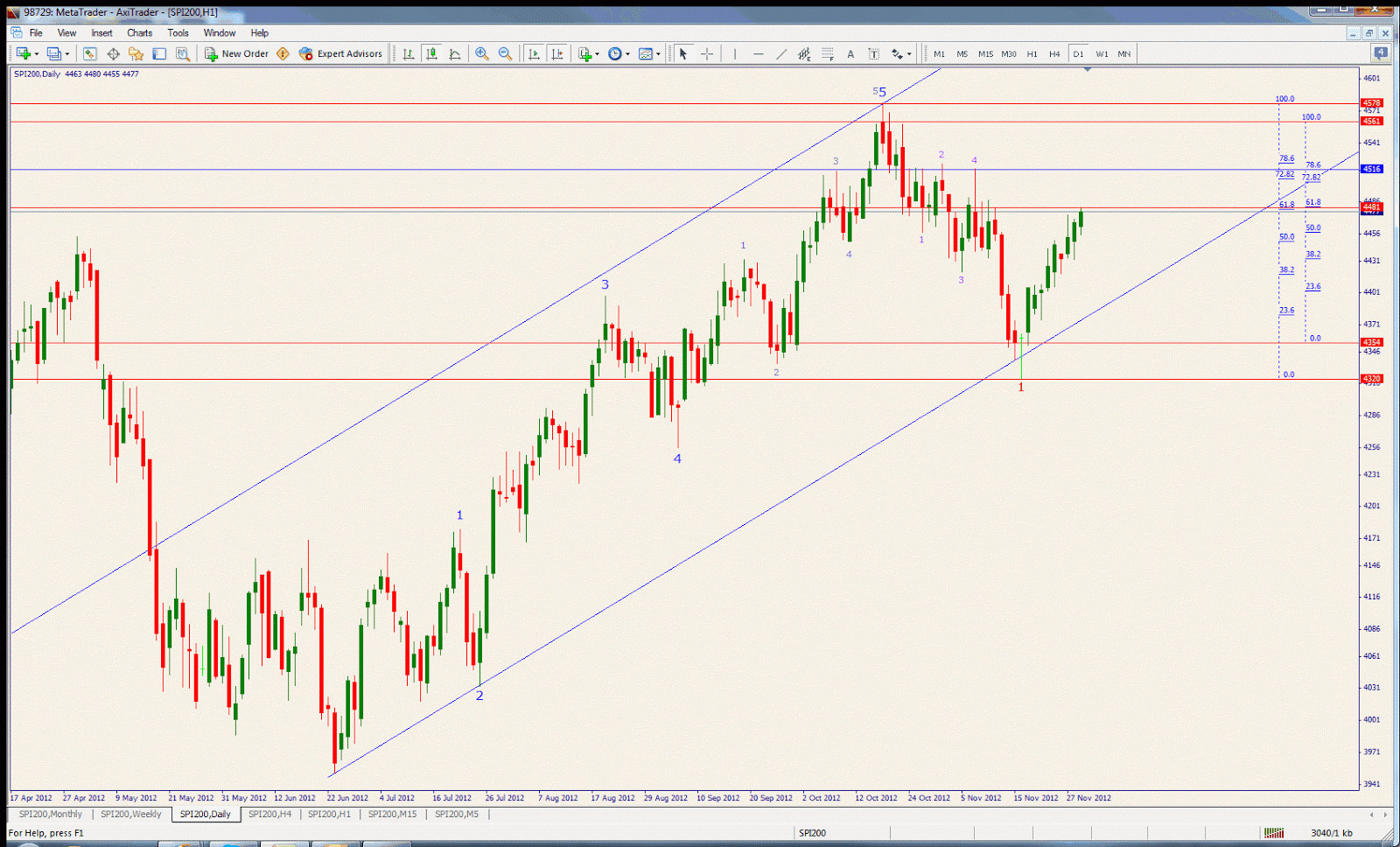 In the daily chart below, the last wave up stopped at 4482 which is exactly the 61.8% retracement of wave 1 in red. However, it should be heading to 4514-17 if it overcomes this resistance
