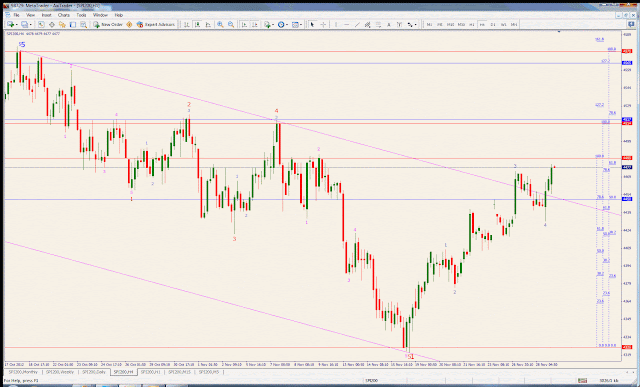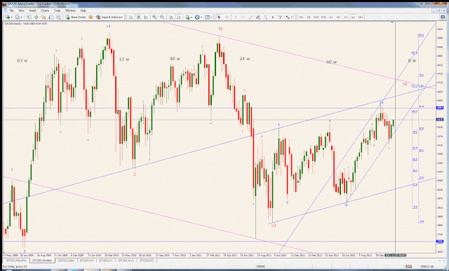 The blue channel - weekly chart below - shows that the major wave 4 (in red, top right, font 12, near the apex of the triangle) is, in turn, made of 5 waves itself. The 5th one is now heading to 4555 and it's theoretically supposed to reach the upper channel line at 4628.