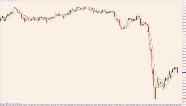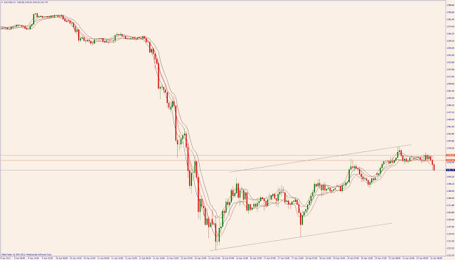 ENTRY: the red lines of the "wave oscillator" - in the 1-hour chart - converged enough to indicate a good entry for a short. If you are not in already, there should be another chance for a short around 1416-17 in the 15min chart
