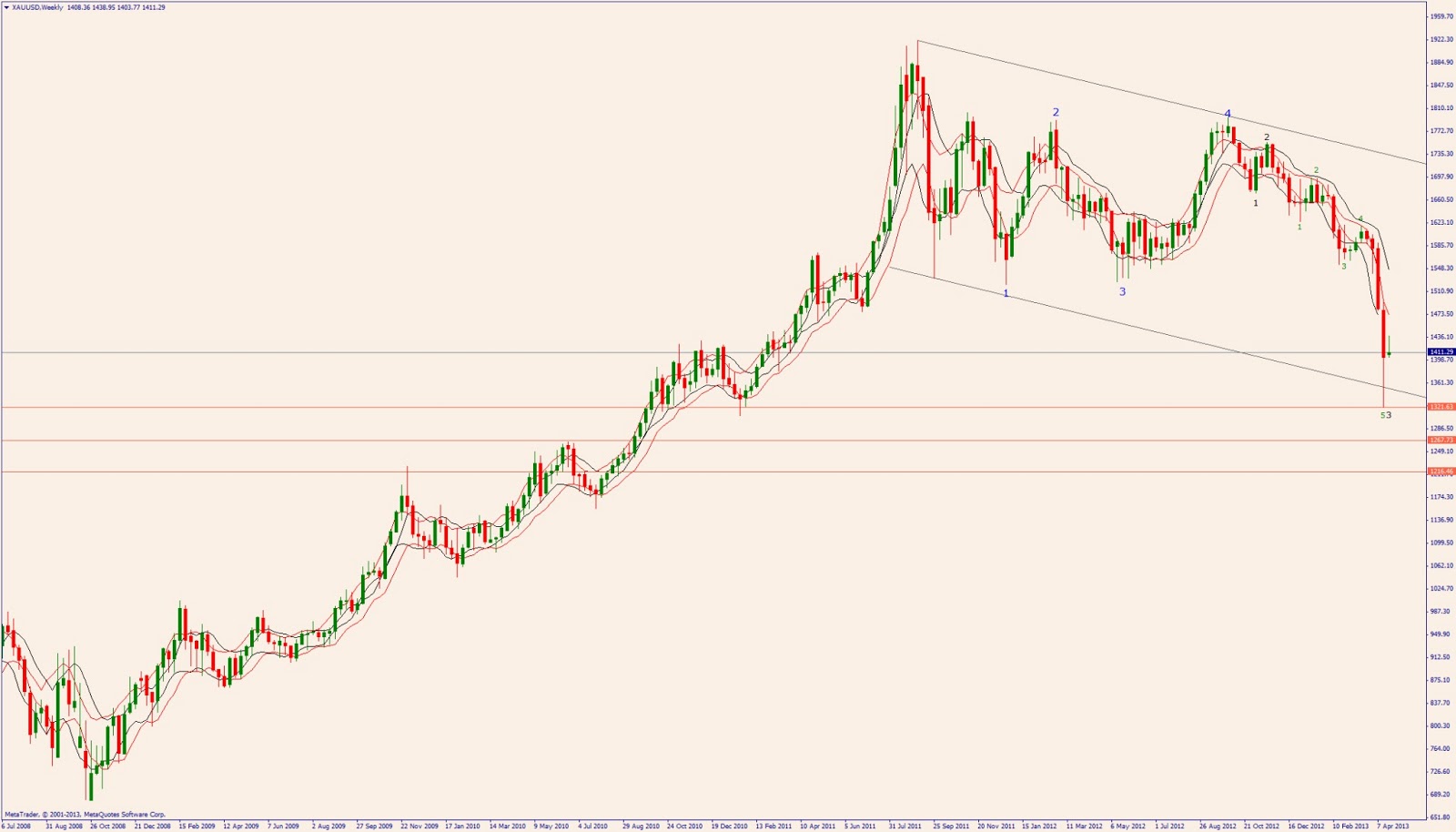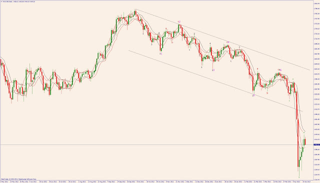 SETUP: in the daily chart below Gold is performing wave 7 downward out of 9. Wave 7 is unfolding, in turn, in 5 waves, 4 of them already in place. The last one (downward) is starting right now. See below wave 4 (in green)