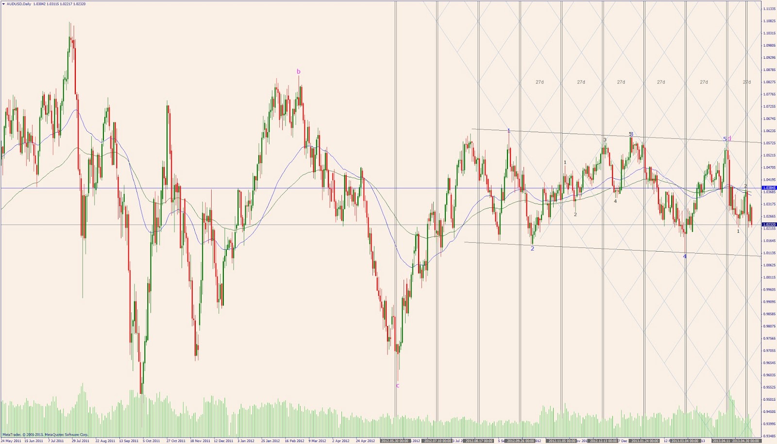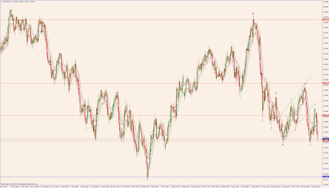 In the daily chart below, the EURUSD performed a large 5dwn-3up-5dwn-3up-5dwn downward to 1.2039. See point "55" at the bottom of the chart.