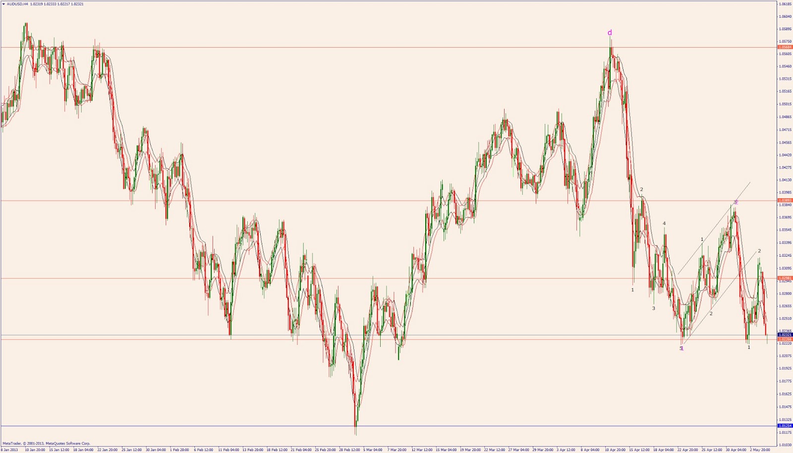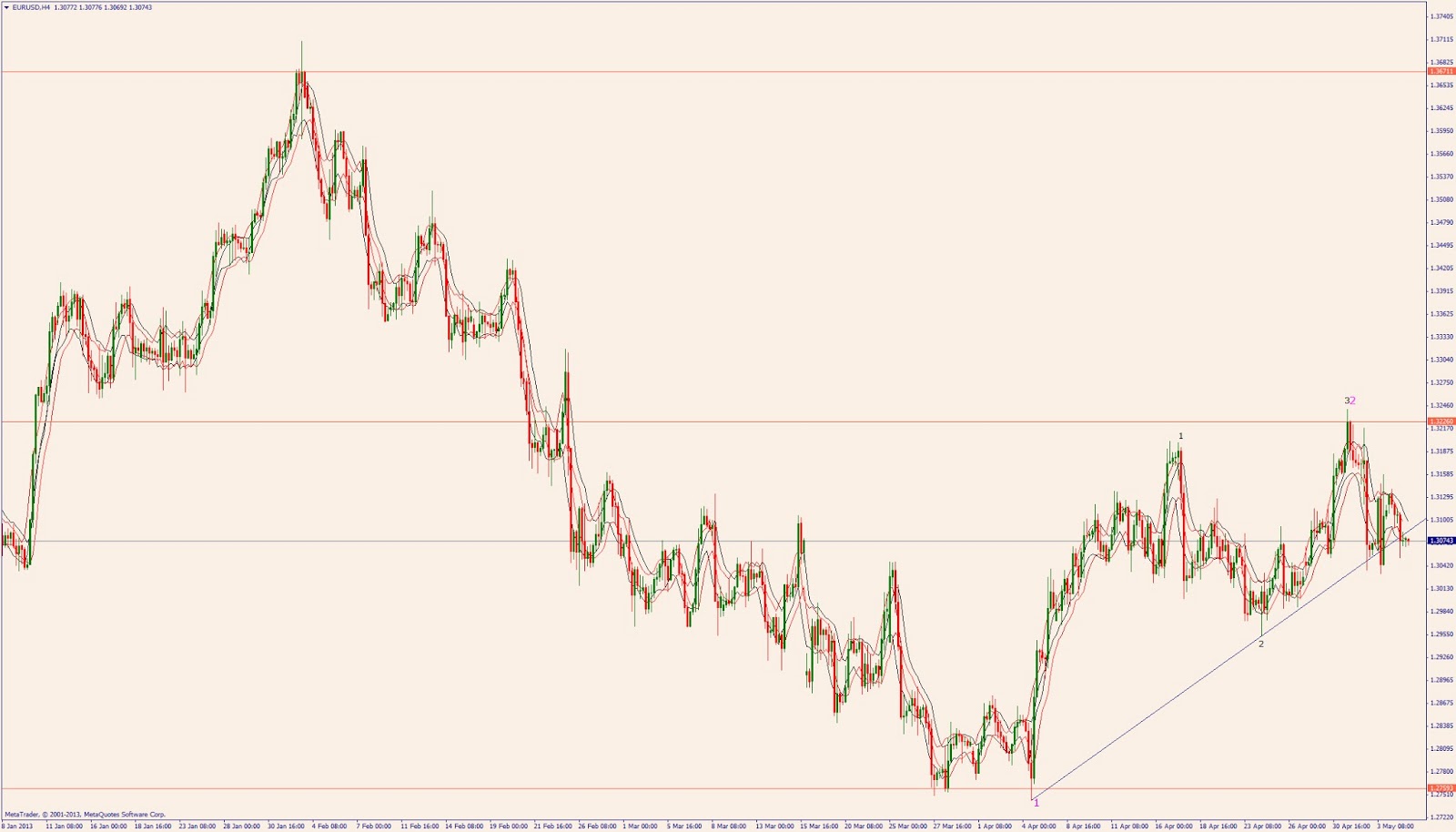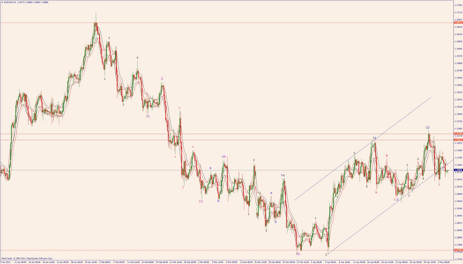 Similarly, in the 4-hour chart below, the EURUSD performed a 5-3-5-3-5 (5 waves downward) to 1.2745, followed by a two-step-pattern (1-2-3 up).