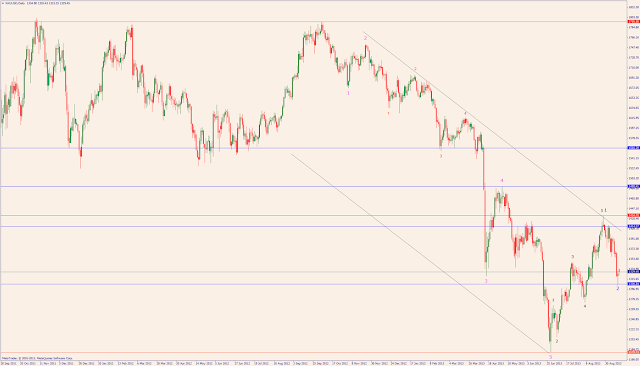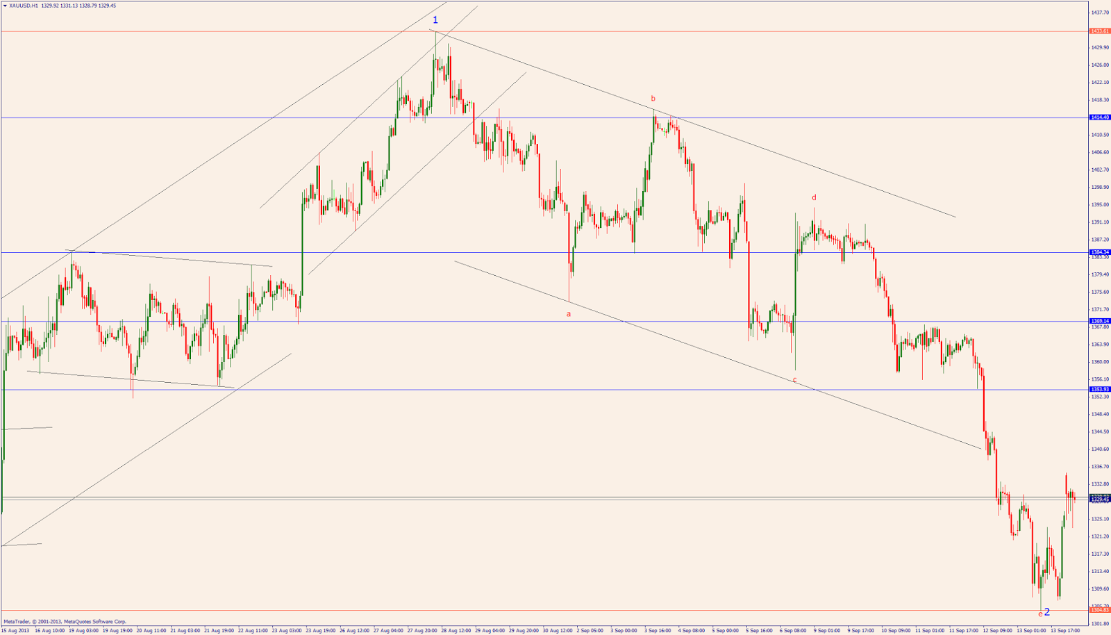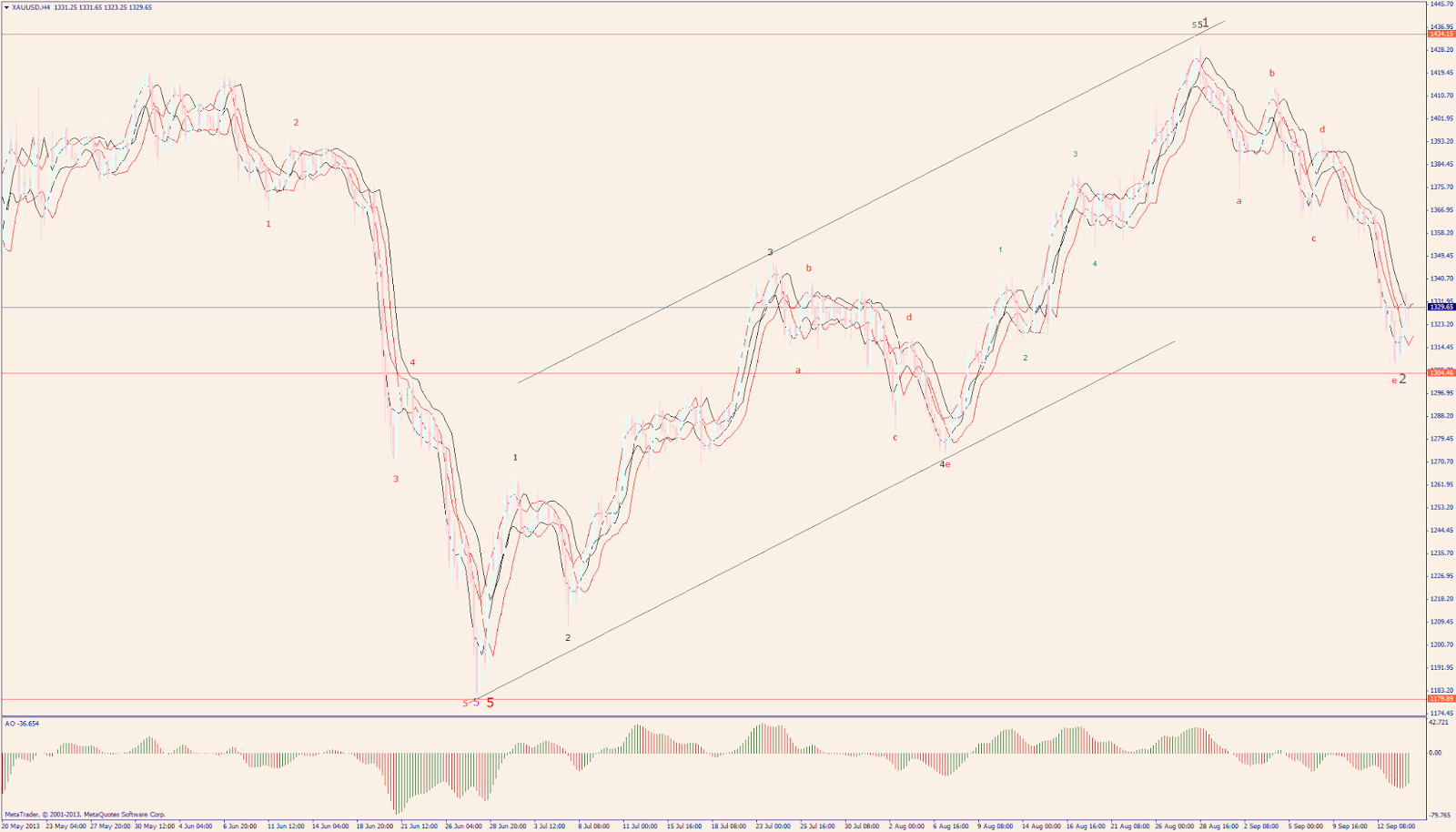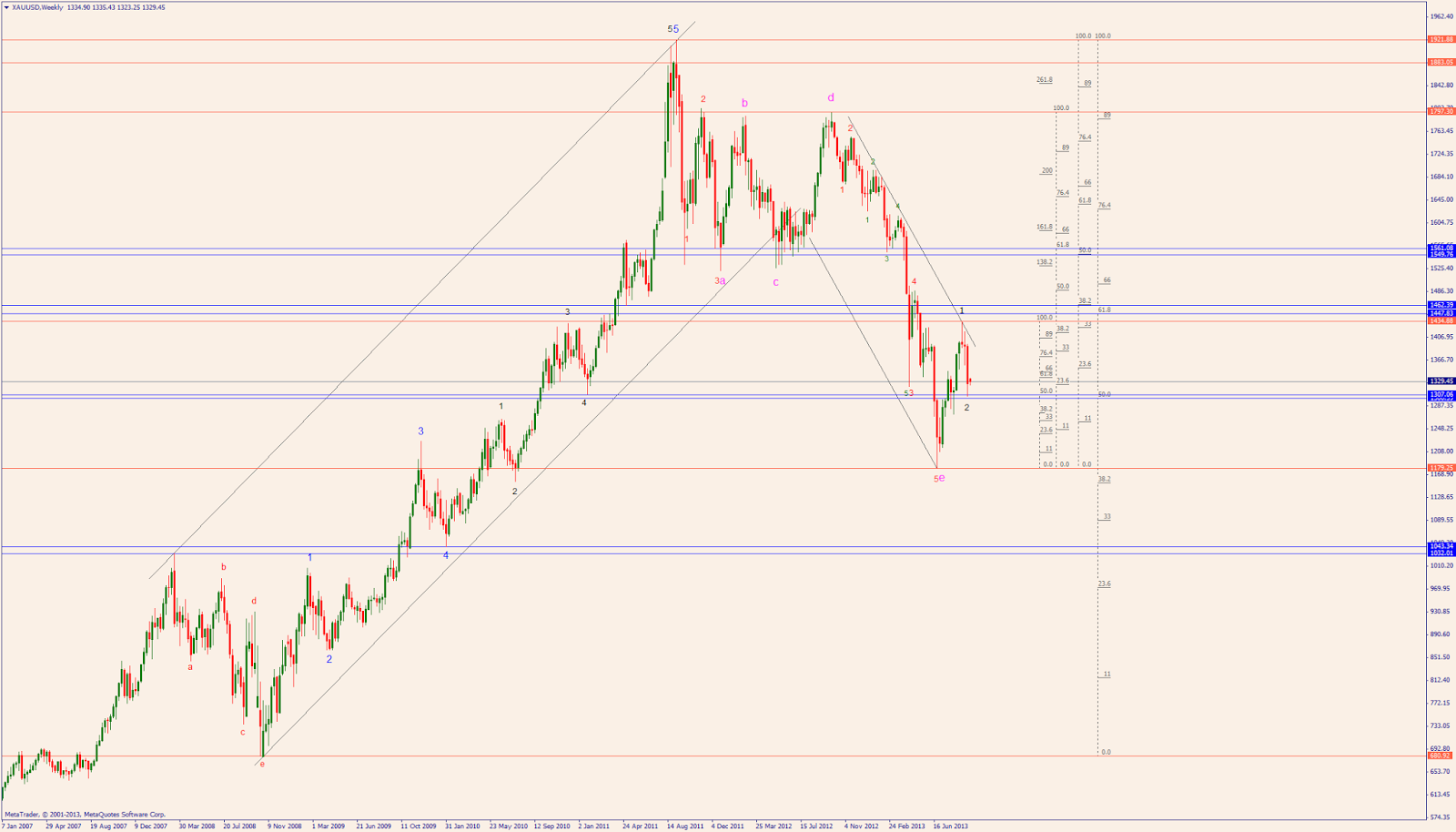 Gold (now at 1327.70) has completed an a-b-c-d-e on the weekly chart and another a-b-c-d-e on the 4-hour chart. The commodity is heading towards the area 1488 and 1560.