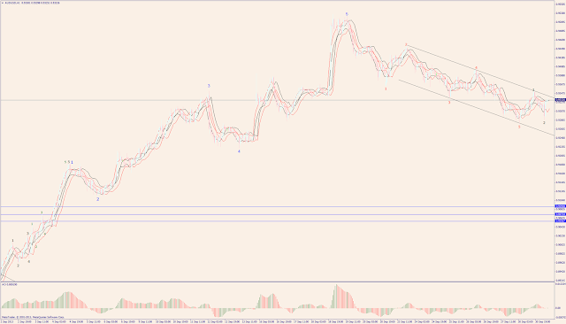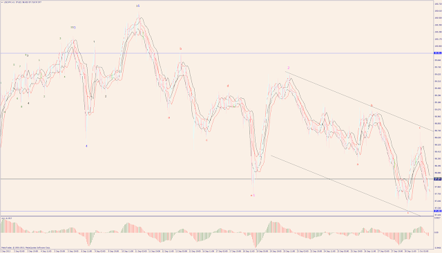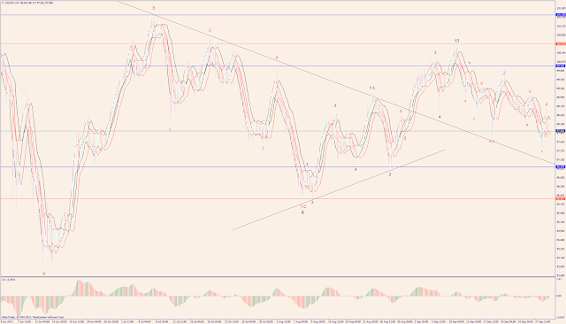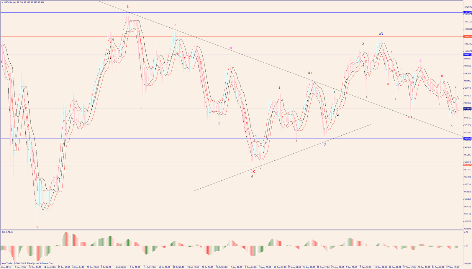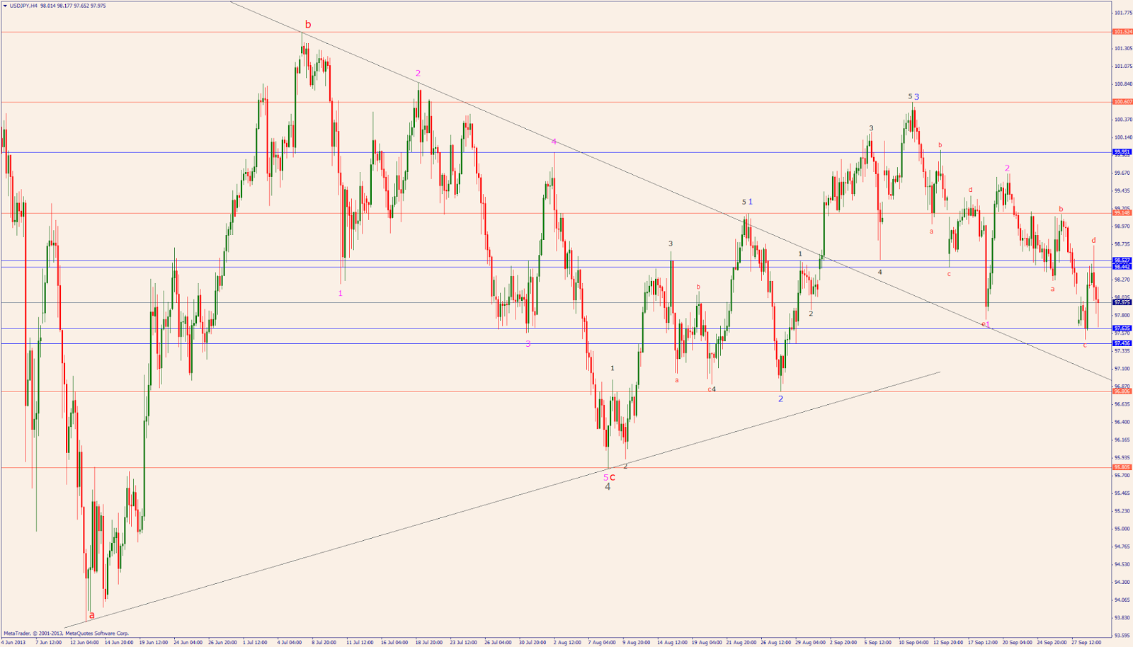 The present downtrend might stop at 97.66 or even 97.48 (1-hour chart). In doing so it would stage a double bottom and start the uptrend much earlier. Hence check the wave oscillator in the 1-hour chart before taking any position.